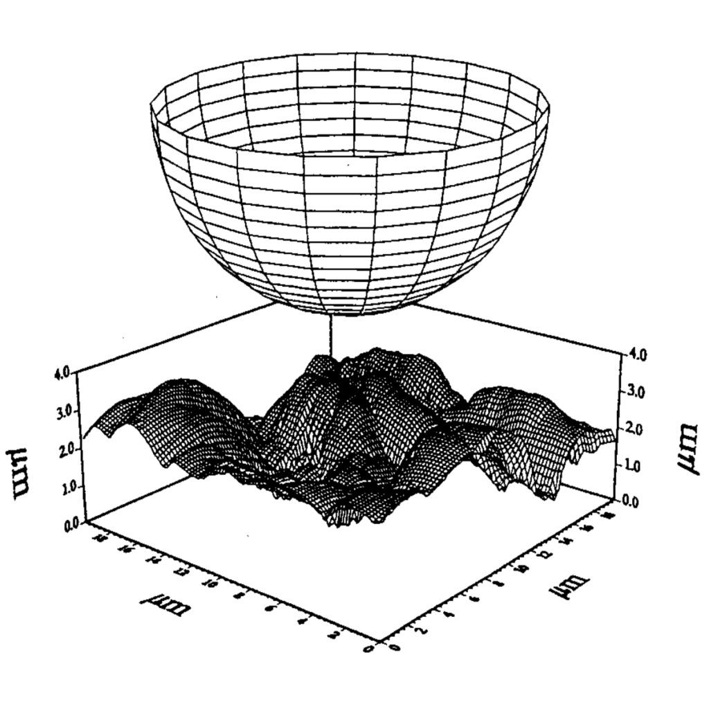 Pero, como vemos en la imagen macroscópica de la derecha, la semiesfera que representa al diámetro de la punta del diamante, es significativamente más grande que los huecos a los que va a medir. Y a todo esto hay que añadir que ejerce una fuerza de diamante contra acero inoxidable que equivale a un millón de Newtons. Lógicamente esto genera un impacto sobre el metal y acaba creando su propia superficie al medir.