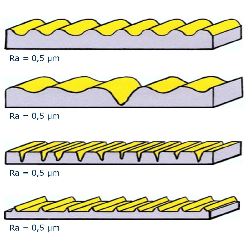 A falta de un método mejor, el valor Ra es nuestro mejor indicador para conocer la calidad de la rugosidad de un tubo, que al final lo que queremos es que nos diga su nivel de higiene o facilidad de limpieza. Pero vemos que, al ser una media aritmética, podemos encontrar que diferentes estilos de rugosidad nos puede dar el mismo resultado, como apreciamos en la siguiente imagen.