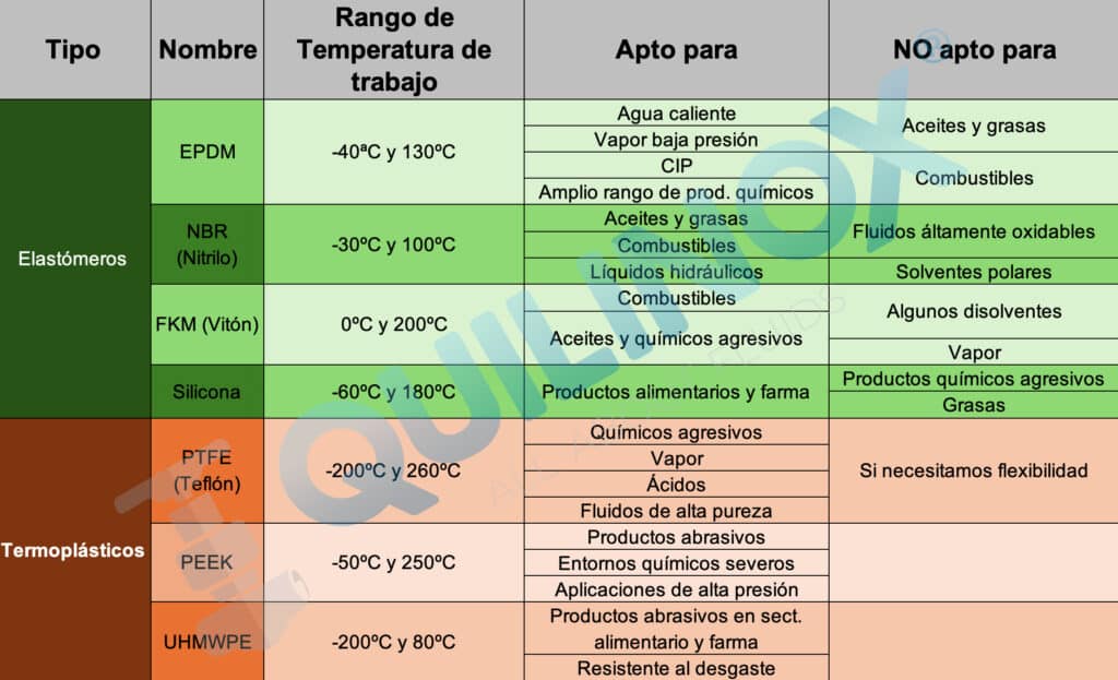 Los elastómeros y termoplásticos se utilizan en toda clase de equipos, desde las bombas o válvulas hasta los clamps. Es por ello que su elección no sólo atañe a las juntas como recambio, sino que cada vez que elegimos un equipo industrial para nuestras instalaciones. Debemos tener en cuenta el fluido que va a pasar por nuestra válvula y sus propiedades. ¿Es graso? ¿Corrosivo? ¿A qué temperatura va a pasar por cada uno de los pasos hasta su envasado? ¿Cuáles son sus propiedades químicas?