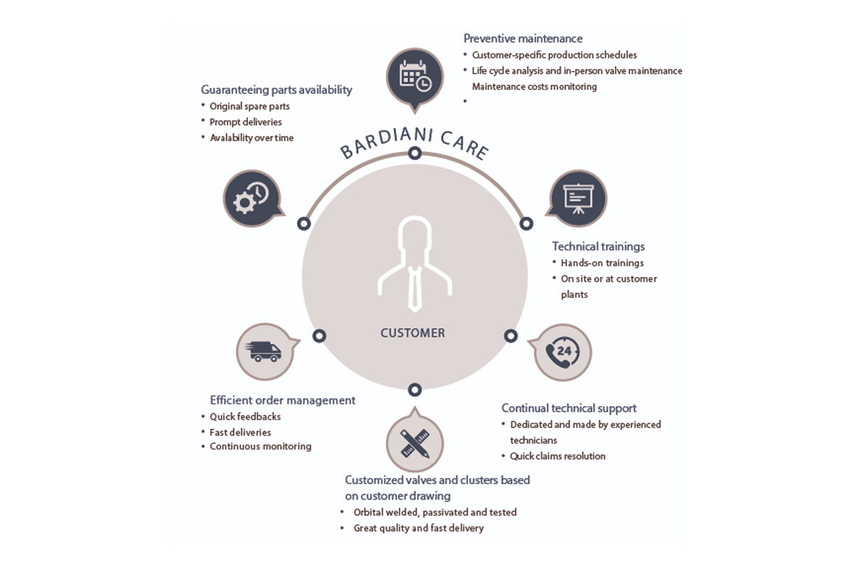 El programa Bardiani Care prevé el registro detallado y el control periódico del estado general de las válvulas mediante inspecciones programadas. Es posible aumentar la eficiencia de los componentes, reducir al mínimo las anomalías y tener bajo control los costes.