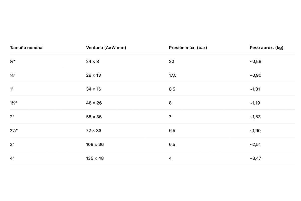 Presión máxima de trabajo: desde 20 bar (½″) hasta ~4 bar (4″), dependiendo del diámetro