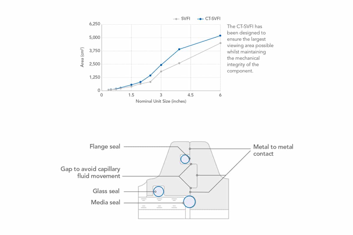 El CT-SVFI es una nueva mirilla diseñada para el proceso aséptico. El extremo de vidrio, la junta tórica y la brida se sellan utilizando una abrazadera clamp.