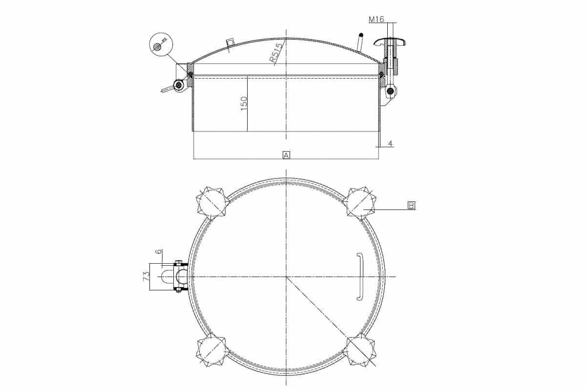 Tapa superior con apertura externa homologada PED. Temperaturas soportadas entre 50 y 250ºC, y presión máxima de 19 BAR según configuraciones. Número de volantes desde 4 a 14 según petición.