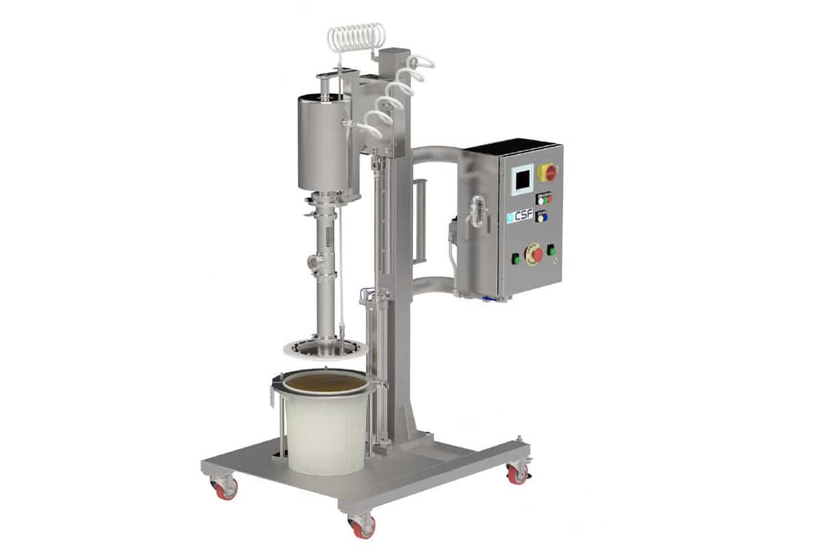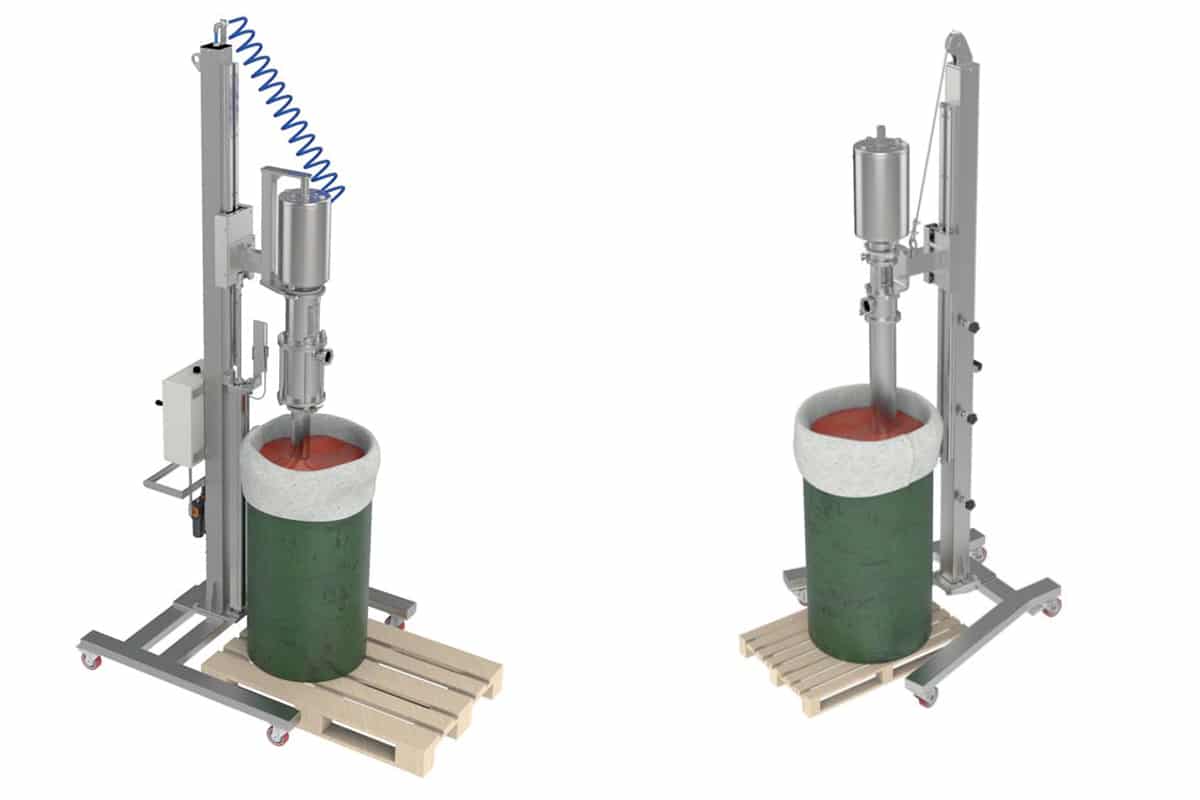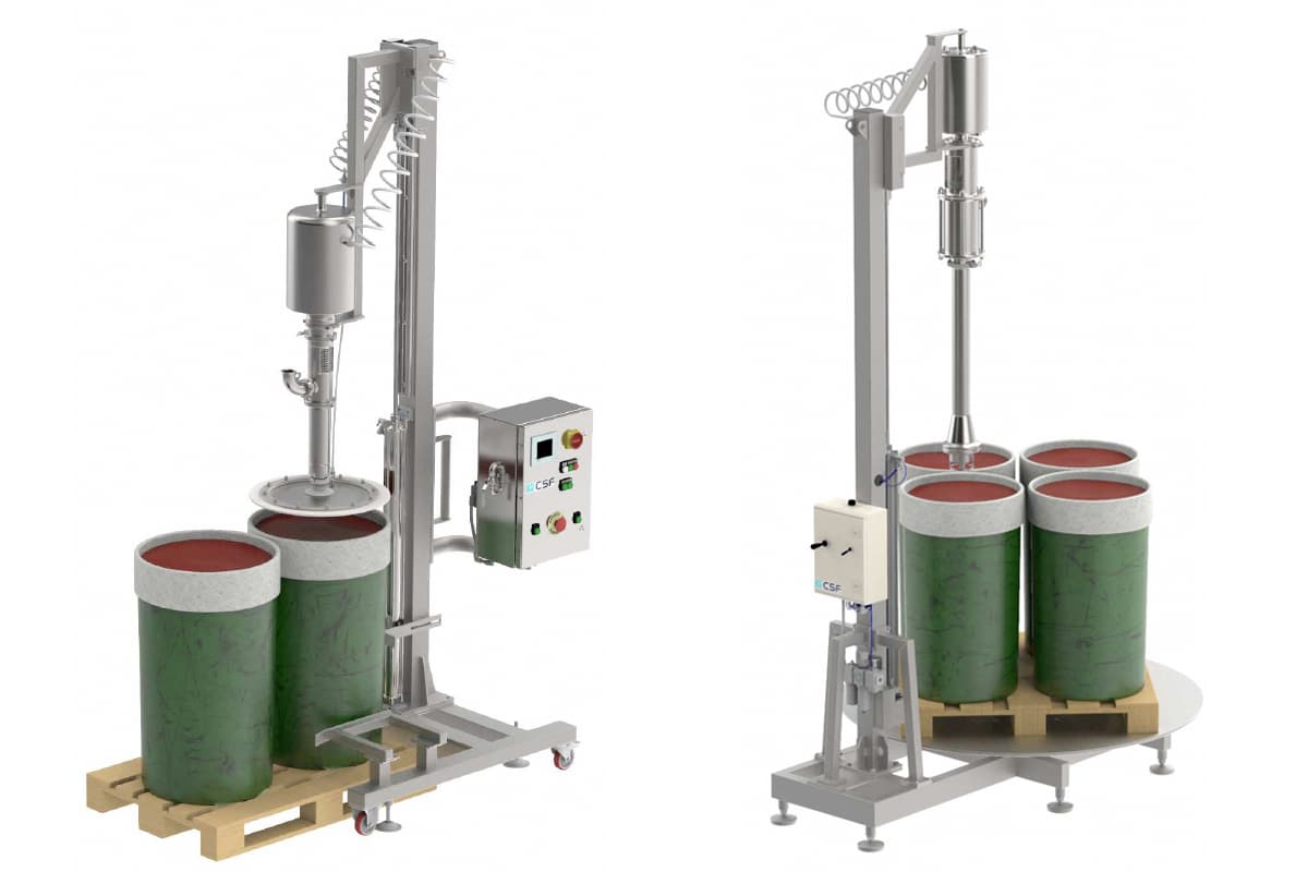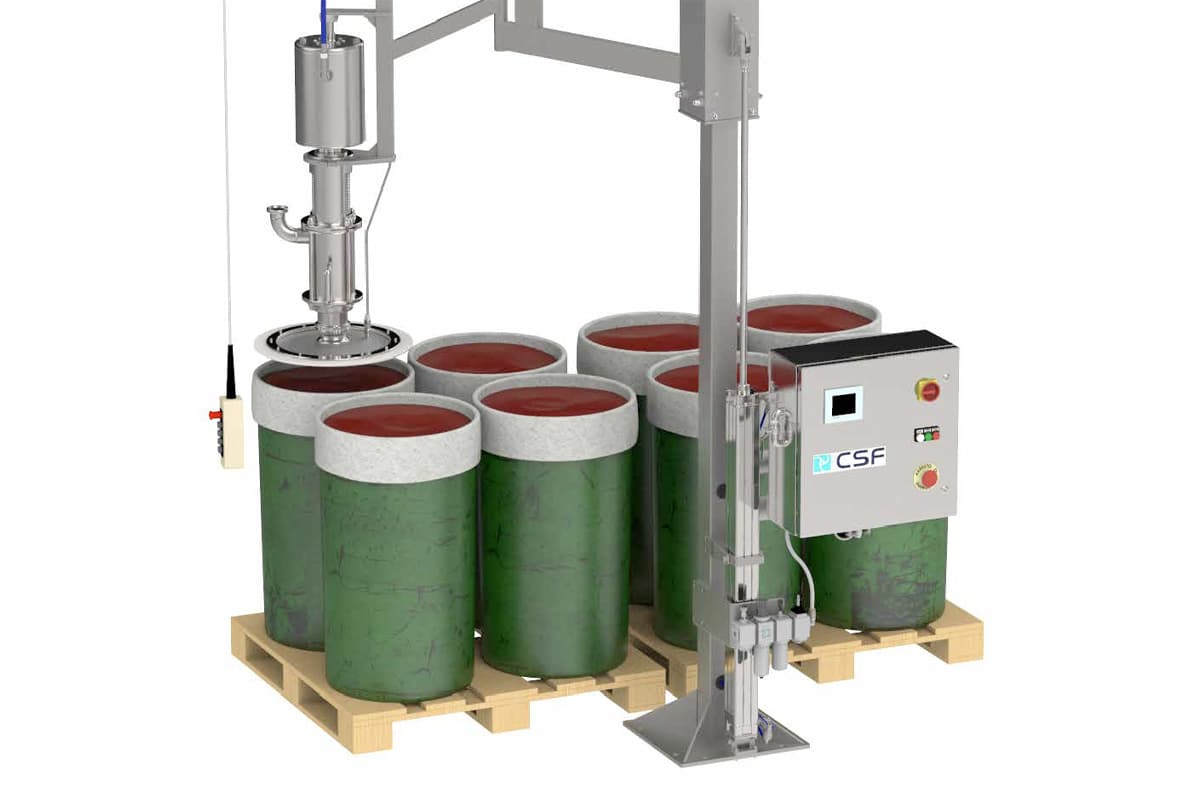 Los sistemas de descarga para bidones de CSF, se componen de una bomba volumétrica de pistón neumática y otros elementos como columnas, carros, sistemas de elevación, PLC… que ahorran tiempo y dinero en el vaciado del contenido de los contenedores de materias primas para la elaboración de alimentos compuestos.